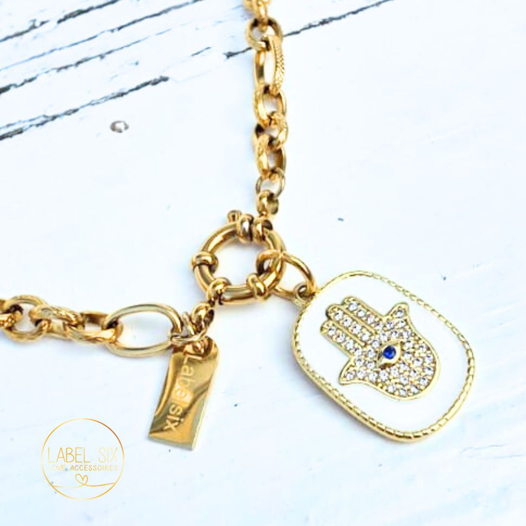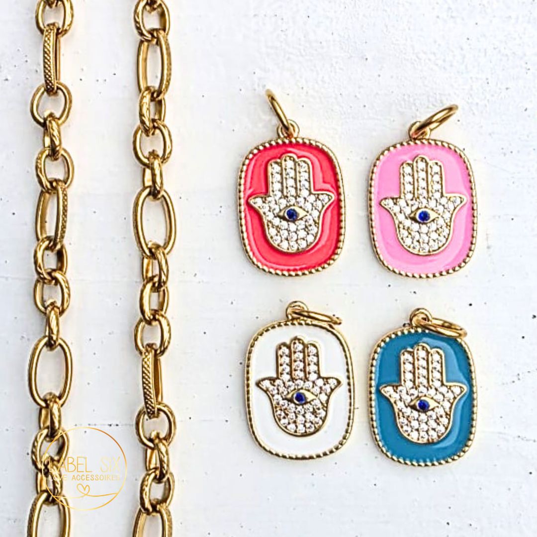 Deze ketting met 4 bedels is gemaakt van 100% waterproof stainless steel. Je krijgt er 4 hamsa hand bedels bij in de kleuren cyaan, zachtroze, turquoise en wit. Zo heb je altijd de perfecte kleur bij je outfit!