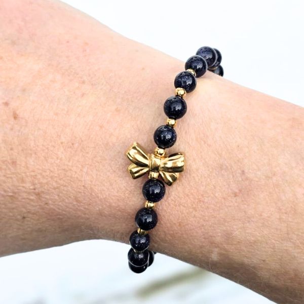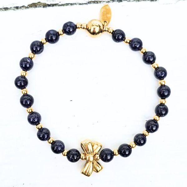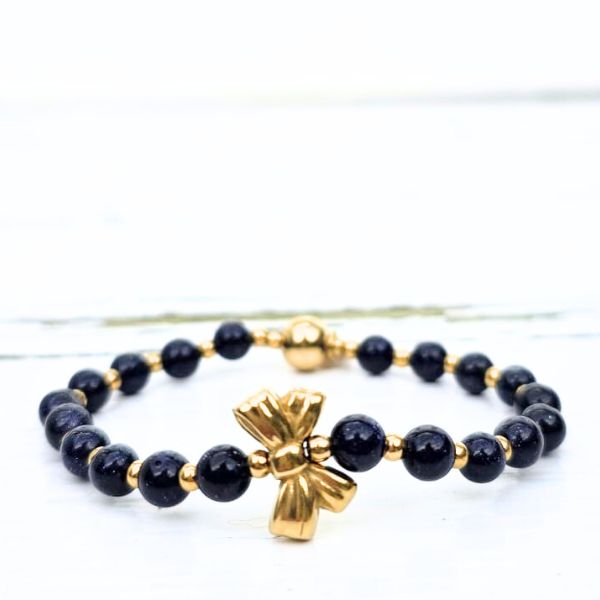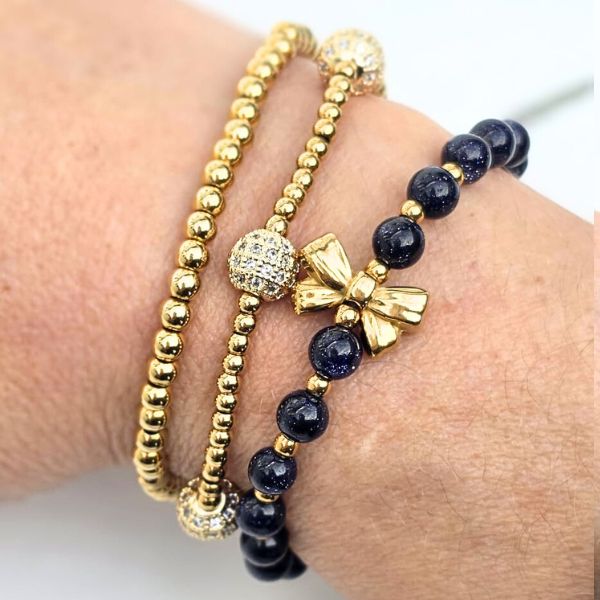 Onze Kralenarmband Blue Bow combineert tijdloze klasse met een vleugje speelsheid. De armband is gemaakt van 3mm gouden stainless steel kralen, afgewisseld met 4mm diep donkerblauwe kralen. In het midden schittert een gouden stainless steel strikje. Subtiel, maar opvallend genoeg om je look compleet te maken.