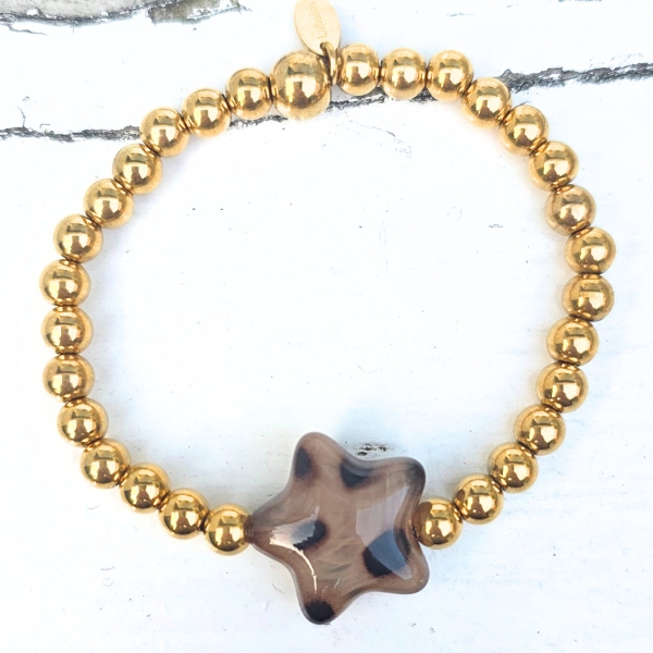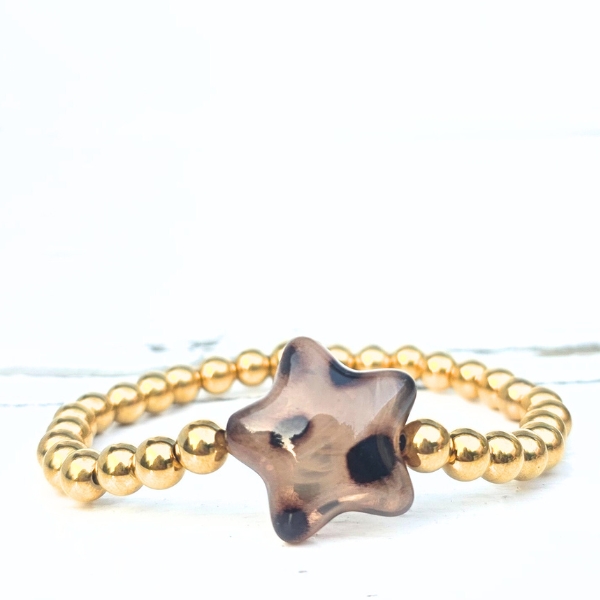 Laat je pols stralen met de Kralenarmband Brown Star – een speelse en stijlvolle toevoeging aan je sieradencollectie. Deze armband is gemaakt van 6mm hoogwaardig stainless steel kralen en heeft in het midden een opvallende, grote ster met trendy leopard print. Het ontwerp is geïnspireerd op de nieuwste najaarstrends en combineert tijdloze metallic glans met een gedurfde, modieuze twist.
