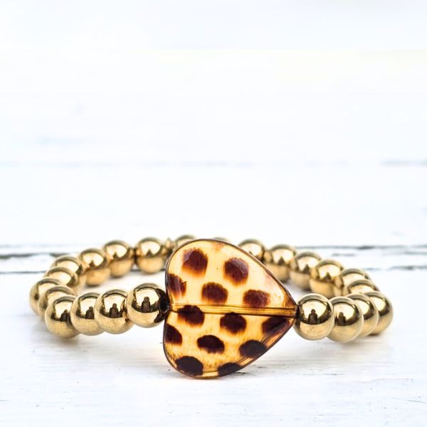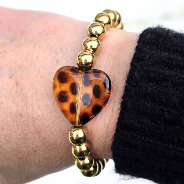 Zoek je een statement kralenarmband met hart en leopard detail? Dan is deze armband een perfecte keuze.