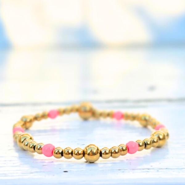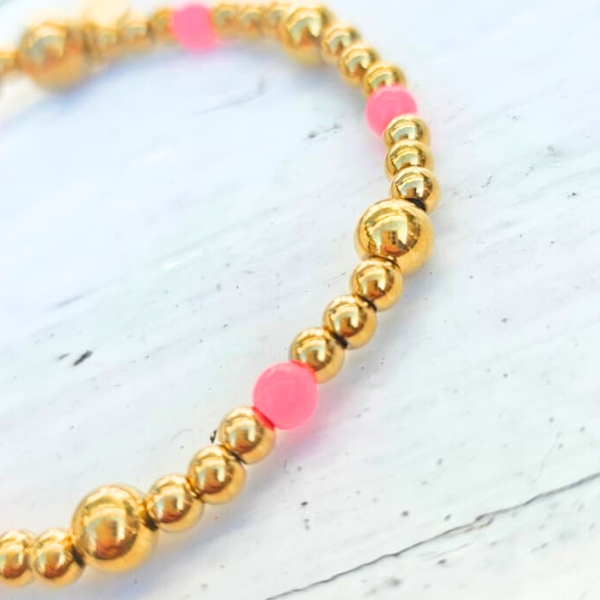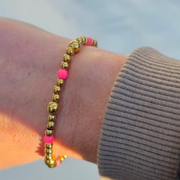 Dankzij het minimalistische ontwerp is de Little Pink Dots armband ideaal om los te dragen, maar ook perfect als onderdeel van een trendy armbanden stack. Combineer deze kralenarmband moeiteloos met andere goudkleurige stainless steel armbanden voor een persoonlijke en moderne look.