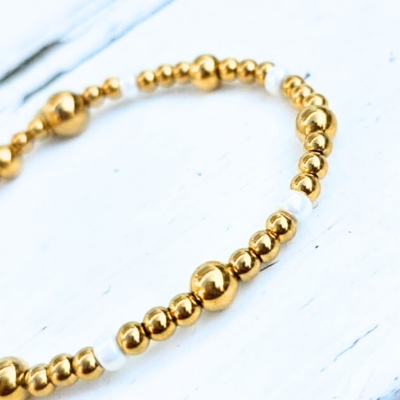 Dankzij het minimalistische ontwerp is de Little White Dots armband ideaal om los te dragen, maar ook perfect als onderdeel van een trendy armbanden stack. Combineer deze kralenarmband moeiteloos met andere goudkleurige stainless steel armbanden voor een persoonlijke en moderne look.