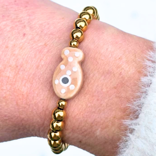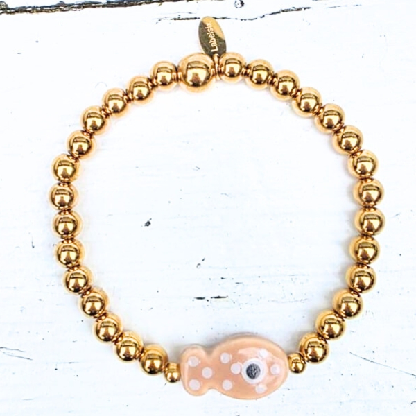 De Kralenarmband Lucky Dots is een subtiele eyecatcher met een speelse twist. Deze armband is gemaakt van fijne gouden stainless steel kralen, in het midden schittert een zachte nude/peach kraal met witte stipjes en een subtiel detail dat doet denken aan een lucky charm.
