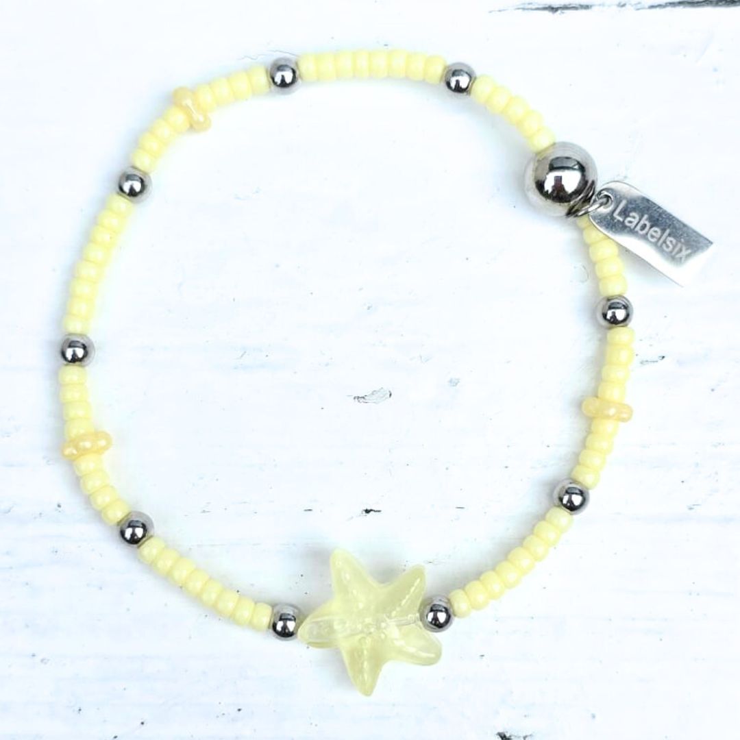 Deze kralenarmband s-line yellow star is gemaakt van 100% waterproof high quality stainless steel kralen in combinatie met zachtgele miyuki kralen in 3mm en een sterretje in zachtgeel.