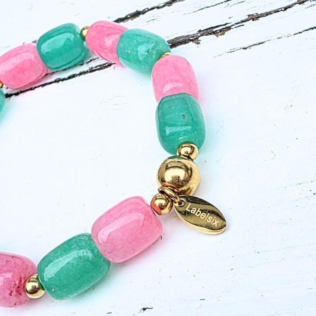✔ Perfect als feestelijke eyecatcher of cadeauDeze watermeloen zomerse look is moeiteloos te combineren met je andere favoriete Label Six sieraden. Draag ‘m solo voor een statement of mix & match met bijvoorbeeld onze andere pastel kleurige armbanden of deze mooie pastel emaille armband.