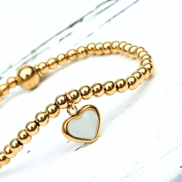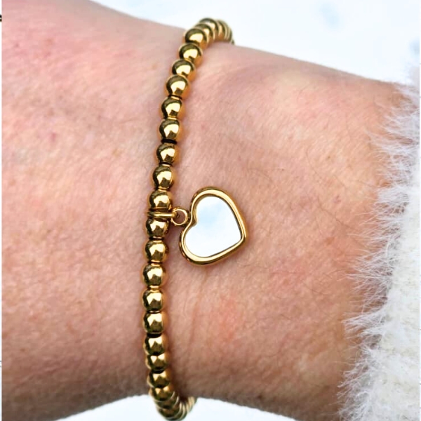 De Kralenarmband With Love is een tijdloze armband met een betekenisvolle touch. Deze elegante armband is gemaakt van fijne 4 mm gouden stainless steel kralen en heeft in het midden een prachtige hartjes bedel met wit parelmoer steen. Subtiel, stijlvol en vol liefde.