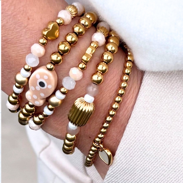 De warme goudkleur in combinatie met het zachte parelmoer geeft deze armband een luxe en vrouwelijke uitstraling. Perfect om solo te dragen voor een minimalistische look of te combineren met andere armbanden voor een stijlvolle armparty.