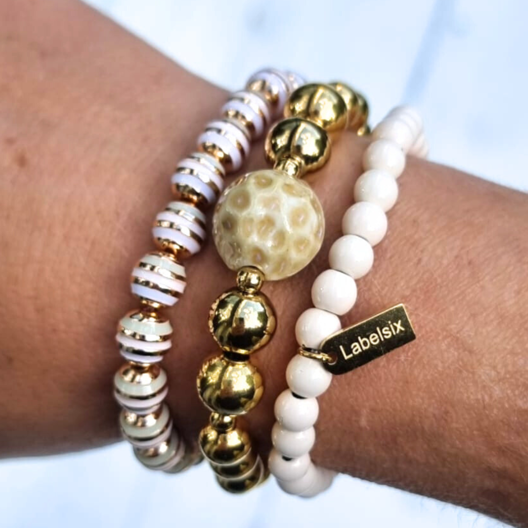 Leopard stone armband creme, trendy armband om te combineren of los te dragen, deze stainless steel armband is geregen op 8 en 10mm kralen, de leopardkraal is 15mm en gemaakt van keramiek. De armband kost € 29,95