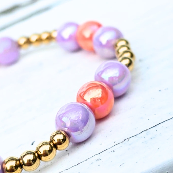 • Parelmoerachtige kralen in zachtroze en lila