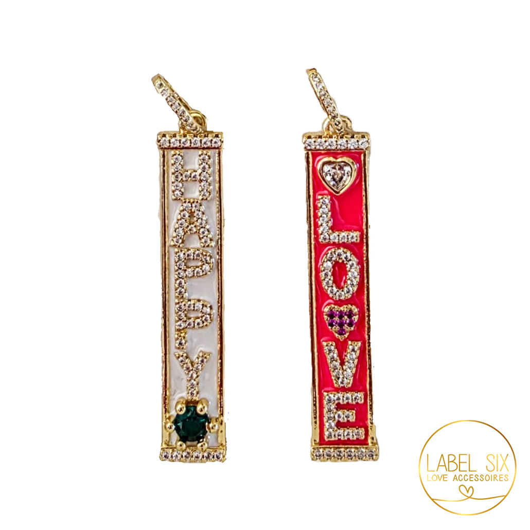 Voeg een flinke dosis glitter & good vibes toe aan jouw sieradencollectie met deze gouden Statement Spark bedels. De woorden LOVE en HAPPY zijn bezet met fonkelende steentjes en kleurrijke accenten die je outfit laten stralen. Draag ze los aan een ketting voor een subtiele spark of combineer ze met meer bedels uit onze collectie.